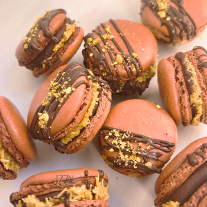 Our indulgent chocolate macarons are filled with a rich ganache and kataifi pastry—shredded phyllo dough toasted until golden and crispy, adding the perfect crunch that balances beautifully with the smooth chocolate filling. What truly makes these macarons stand out is the pistachio cream, made from scratch using high-quality pistachios to create a velvety, nutty paste that pairs perfectly with the chocolate and crispy kataifi.